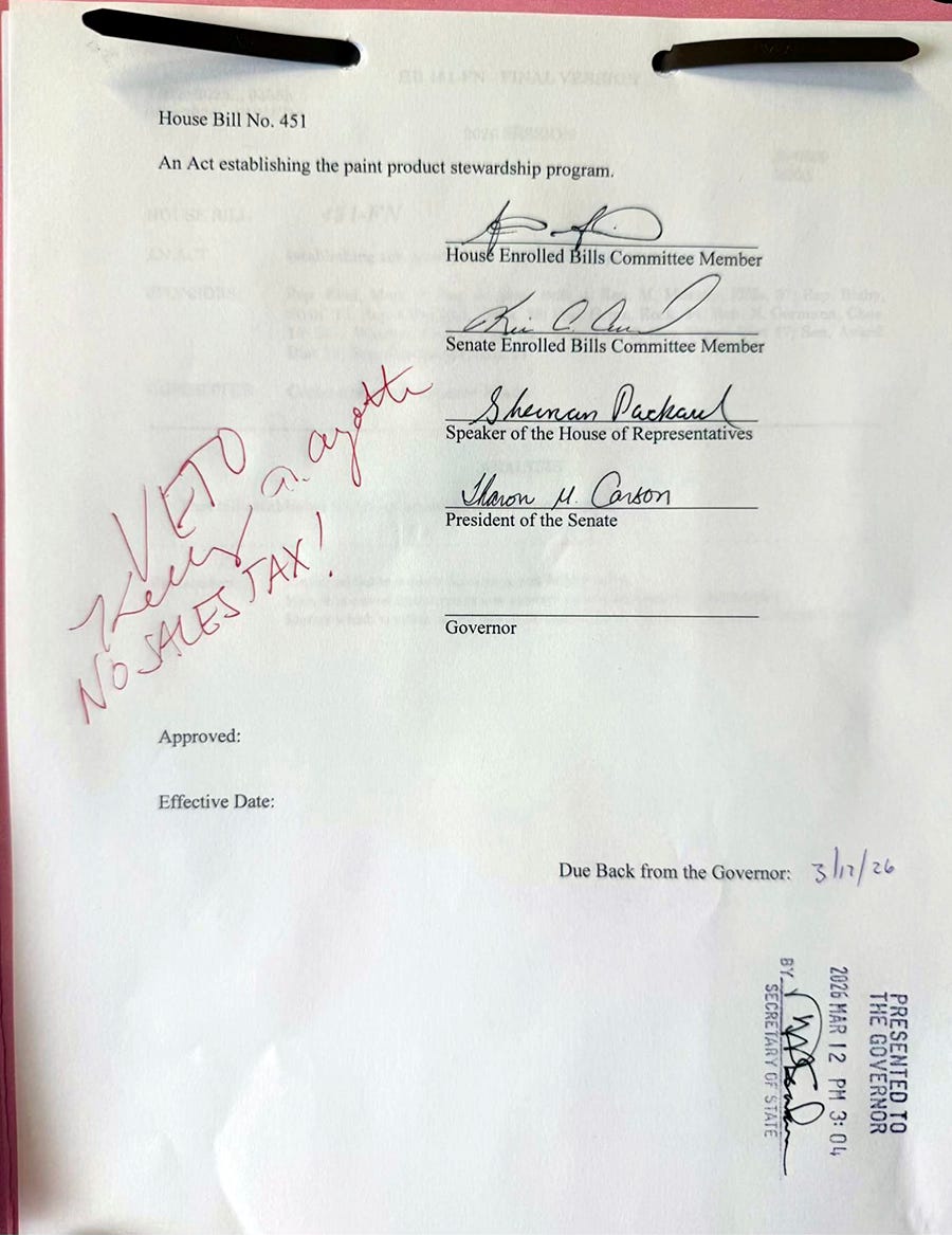 House Bill 451, requiring paint manufacturers to submit a stewardship plan outlining procedures for the collection, storage, transportation, reuse, recycling, energy recovery, and disposal of paint sold in New Hampshire, had the support of a broad range of interests, including Casella Waste Systems, the Business & Industry Association, and the New Hampshire Municipal Association — but not Governor Kelly Ayotte, who vetoed the bill, posting her objection on social media with the handwritten “NO SALES TAX!”